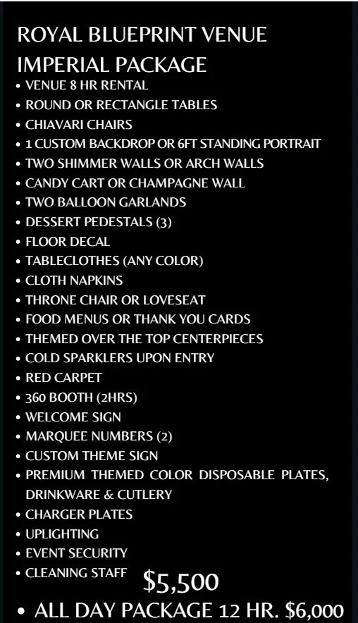 Working with Asia from Royal Blueprint Events for our 50th birthday celebration was great! The venue is in a cute nook in Brooklyn, NY. They have different tier options that allow you to book the venue as well as decorations. You get security for your event and everyone I worked with was courteous and professional throughout the process. On the day of the event the space was ready for the event on time with gorgeous table settings and center pieces. Paired with the personalized photo backdrop, welcome sign and table cards all in our requested color scheme. Everything was giving grown and Sexy for this milestone birthday party! Bring your food and drinks and you're good to go! I would definitely book this venue again for another event!