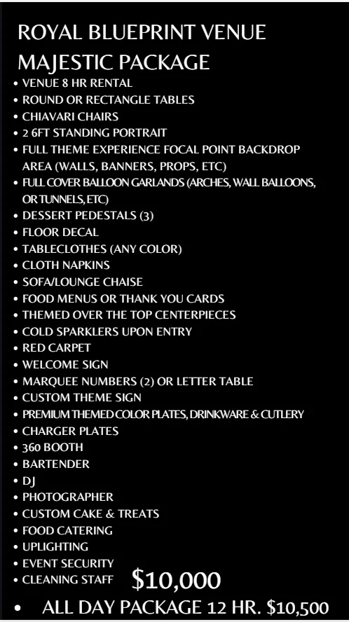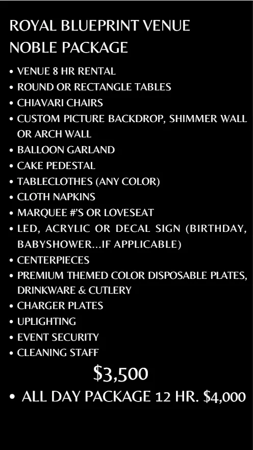 I recently had my 24th birthday dinner party here and I can definitely say Royal Blueprint NY is the place to host your events. The first moment I viewed the venue Asia was very informative and saw the vision I was trying to go for. Within the first couple months of me planning for the party, Asia made sure to stay in contact with me and even texted me when she had any ideas of her own. Once she sees the vision you have you can count on Asia to go above and beyond, her work does not lie. Everybody that came to celebrate with me told me they loved the decor and the attention to every single detail. So with this being said please DO NOT HESITATE to book and have your party here, I look forward to hosting more events at Royal Blueprint NY in the future.