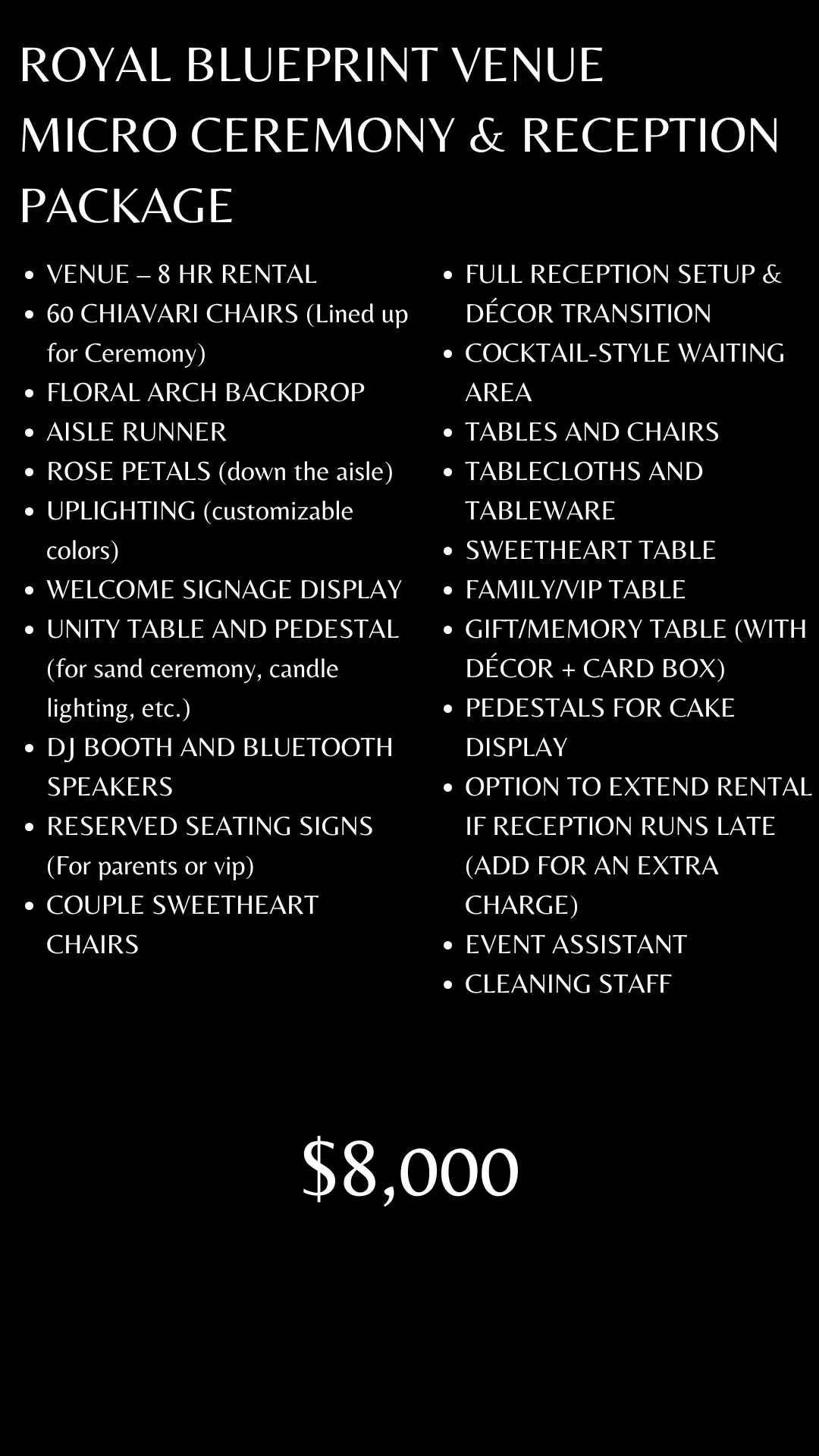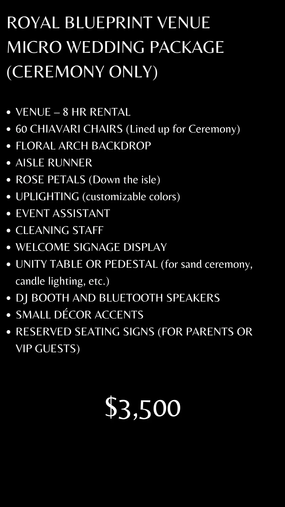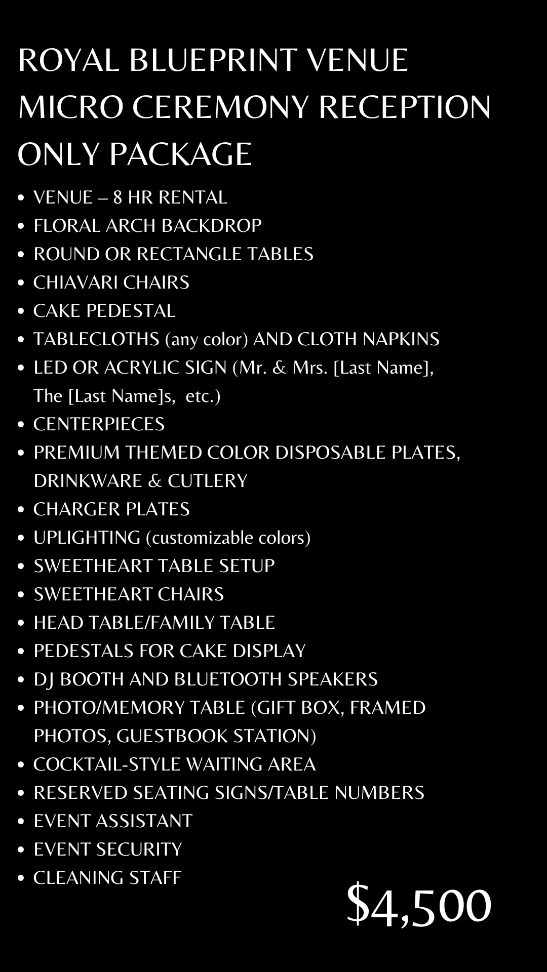Yes. Here are some of the offers we include: Venue rental, Event planning and coordination, Décor and setup (tables, chairs, linens, centerpieces, etc.), Catering and drinks, Staffing (servers, bartenders, security, etc.), Entertainment (DJ, live music, etc.), Photography and/or videography, Cake or desserts, Clean-up services.